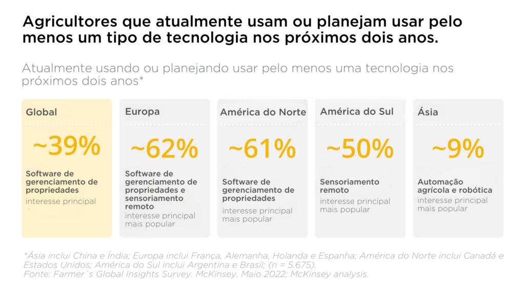 Nos últimos anos, agricultores e outros atores da indústria adotaram a AgTech para uma variedade de casos de uso, incluindo gerenciamento de fazendas, sensoriamento remoto, hardware de agricultura de precisão e automação, entre outros. América do Norte e Europa estão liderando a adoção da AgTech, enquanto a Ásia permanece um mercado inexplorado. De acordo com uma pesquisa da McKinsey publicada em 2023, mais de 60% dos agricultores pesquisados na Europa e América do Norte estão atualmente integrando ou planejando integrar tecnologias inovadoras, enquanto a Ásia está muito atrás, com apenas 9%.