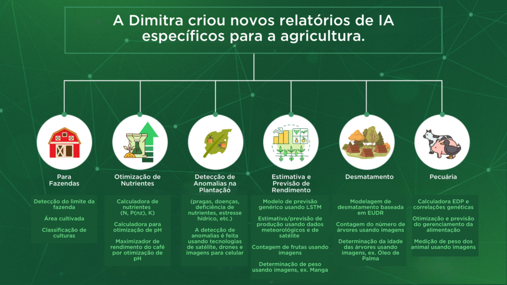 Além disso, os algoritmos de IA da Dimitra utilizam dados históricos de clima e satélite para estimativa de rendimento e previsão, capacitando os agricultores a tomar decisões informadas com base em análises preditivas.